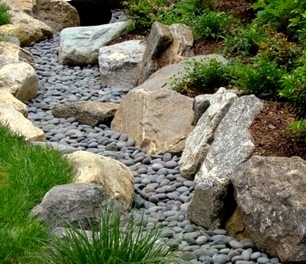 install very large boulders half or 2/3rds buried and grouped at outside curves and at any waterfall, install small river stones at bottom. Create areas with shallow pools so that water is detained and will slowly soak into the ground. Flat rocks at lower edge of pools helps create waterfalls. If there is adequate existing slope for waterfalls, use several low height waterfalls such as typically 4-6 inch not higher. Never line stream edges with uniform size rocks. Use dark gray or black river rock and boulders for more natural look